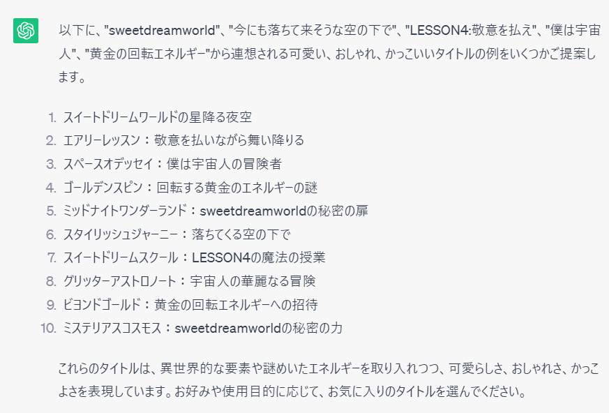 なんか違うな。僕のいうおしゃれはBLEACH、ジョジョとかのオサレ感とかなんだよね。ChatGPTのインプットに記述してみます。