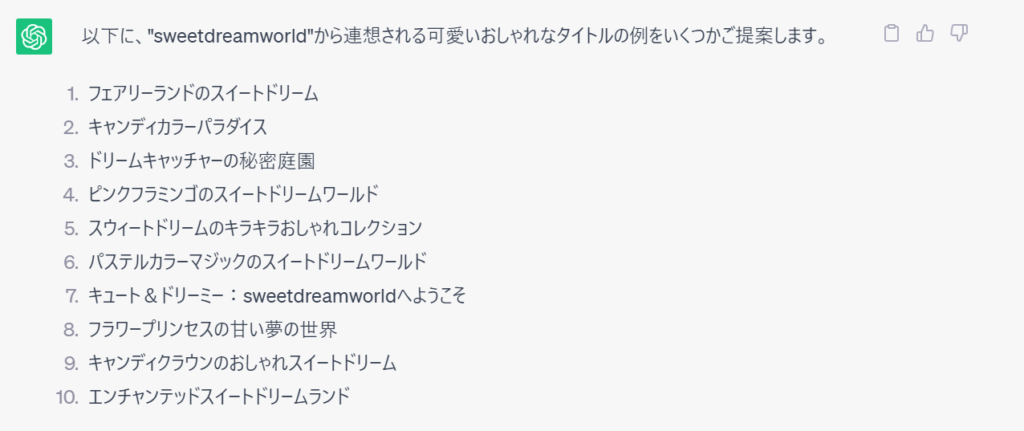 AIから提案されたドメイン名が 「sweetdreamworld」でした。夢、世界が入っていて可愛いので良いなと思いました。安直ですね。