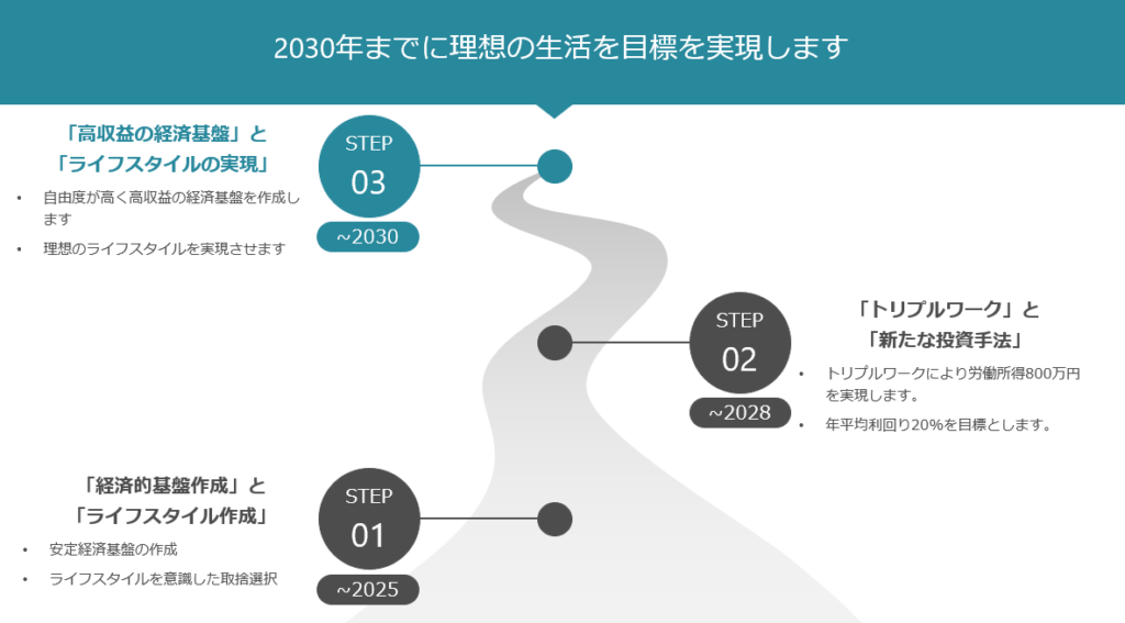 でも具体的に、どのような要素が必要なのか分析して、計画を立てないとただの夢物語になります。以下では年単位のロードマップを作成し、計画達成度を考えてみたいと思います。