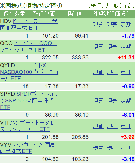 投資信託とETFの違いを知りたいのと、外国のETFを購入して見たかったので、VTI、HDV、VYM、SPYDを購入する。