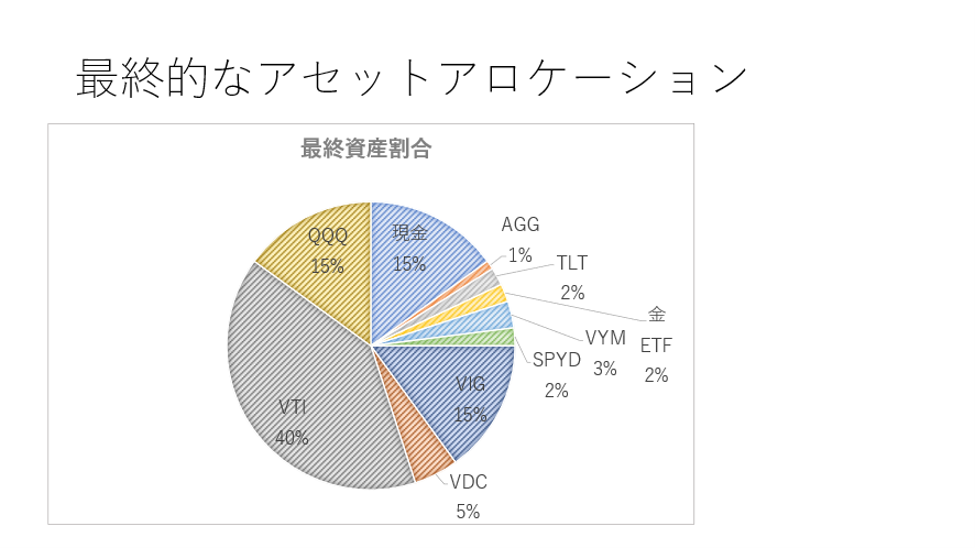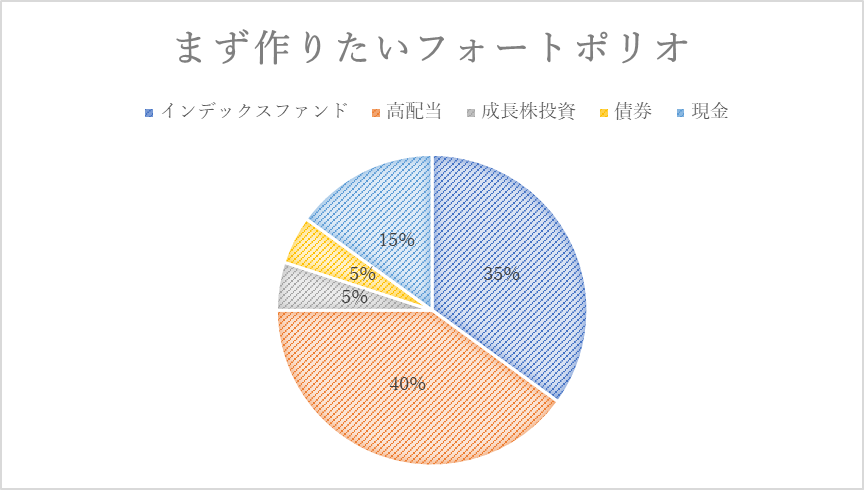 人生で初めて作ったポートフォリオ。インデックスファンドと高配当ファンドを組み合わせたポートフォリオ。現金と債券で年齢分という点を意識したと思う。